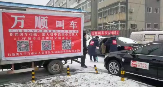 在北京市,万顺叫车北京分公司购买消毒水和防护用品发放到各个服务中心,用于疫情防控工作。在防控疫情的关键时刻,万顺叫车北京分公司100余名司机合伙人主动站出来,冒着随时被传染的风险,不畏严寒,甘当志愿者,为这场突如其来的疫情,贡献自己的一点绵薄之力。他们共分成5支"爱心车队",去往医院和社区,为患者、出行不便的群体、医护工作者提供义务接送服务。